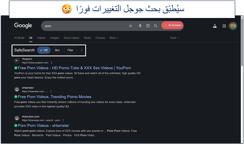 يُخفي البحث الآمن من جوجل العديد من المواقع الإباحية المشروعة، مما يُصعّب العثور على مصادر آمنة للمواد الإباحية. تُفعّل محركات البحث الرئيسية مثل بينج وياندكس إعدادات مشابهة افتراضيًا. يمكنك تغيير هذه الإعدادات أثناء البحث أو في إعدادات بحث جوجل، بخطوات بسيطة.